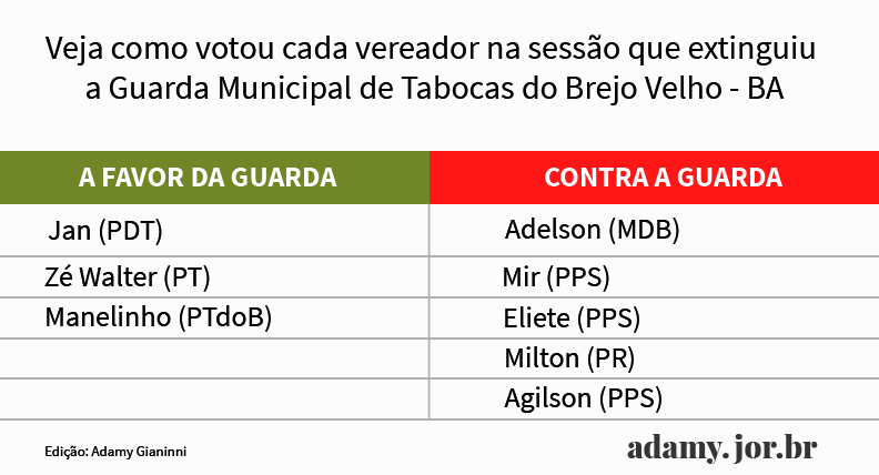 A Câmara Municipal de Tabocas do Brejo Velho, Oeste da Bahia, aprovou na última sexta-feira (25) o projeto que ratificou o Decreto Municipal nº 110/2018, extinguindo oficialmente a Guarda Municipal.